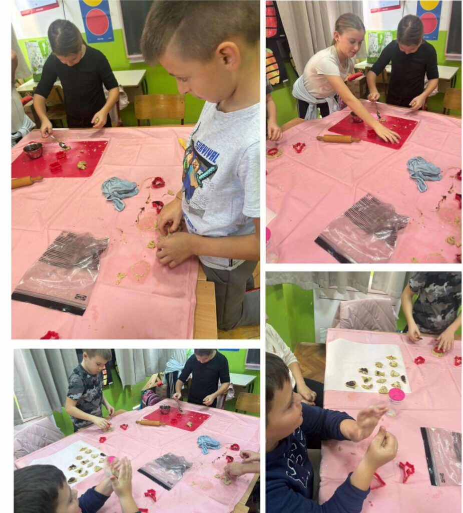 Učenici produženog boravka, zajedno sa svojim učiteljicama, s velikim su veseljem sudjelovali u pripremi božićnih slastica. Vrijedne ruke miješale su razne smjese, a kuhinjom su se širili mirisi svježe pečenih keksića i kolača koje su pripremali za domjenak nakon božićne priredbe. Tijekom rada vladalo je veselo raspoloženje, smijeh i zajedništvo, a cijeli je proces bio ispunjen toplinom i pravim božićnim duhom. Učenici su s ponosom sudjelovali u svakom koraku, radujući se što će svoje slastice podijeliti s drugima.